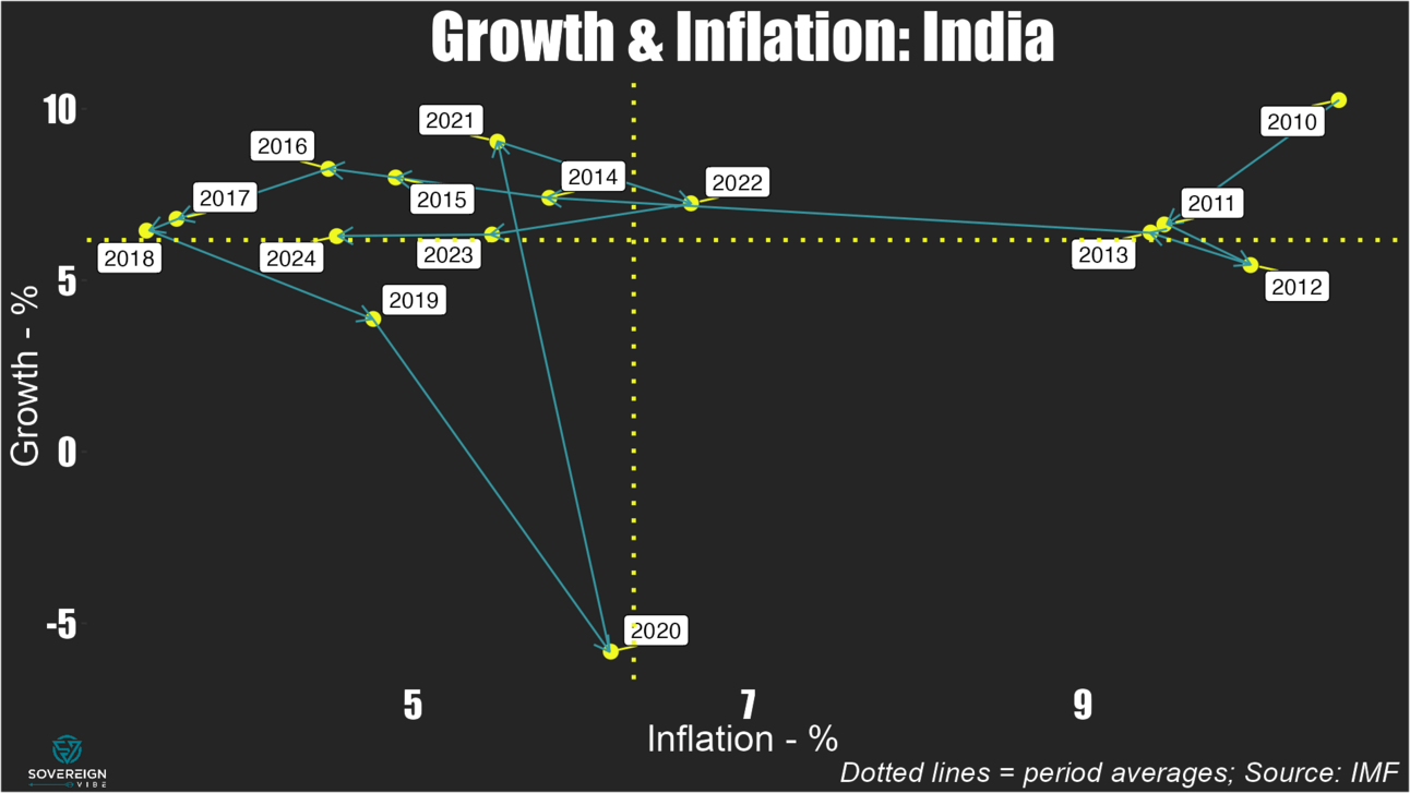 Growth rebounded strongly thanks to a post-2020 base effect, breaching 9% in 2021 before moderating to ~7+% in 2022 and ~6+% in 2023 and 2024. These are excellent numbers, particularly given that inflation is gradually declining towards the Reserve Bank of India’s 4% target. All of this situates growth and inflation above and below their averages since 2010, respectively (see chart below). So it is little wonder that Narendra Modi’s BJP is so strongly positioned as India heads to the polls.