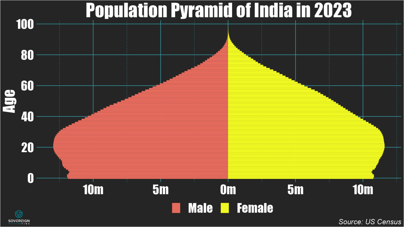The pyramid below has an ideal shape for economic growth in India over the next decades. A huge cohort of young people - the world’s largest - is moving into the workforce, even as birth rates moderated over the past couple of decades. This will decrease the dependency ratios of the young and old on people of working age and likely contribute strongly to growth, savings, and development in the years ahead.