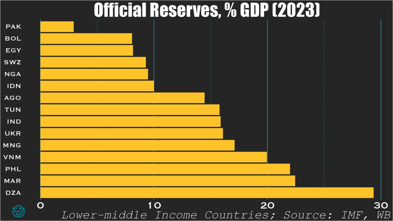 Turns out I was right: among countries in its income bracket, Pakistan has the lowest reserves-to-GDP ratio of all.