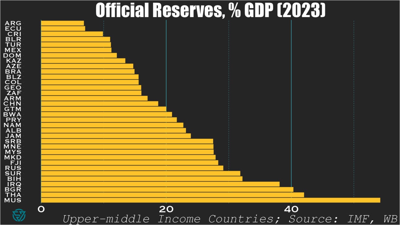 Well, Ukraine is a lower-middle income country fighting a war and undergoing debt restructuring. Yet Kyiv still manages to have more in the bank than wealthier countries with much lower-levels of security threats.
