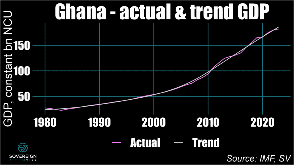 Sri Lanka is perhaps the most interesting case, even if the data is only through 2022: a sizable positive output gap – indicating potential overheating in the economy – preceded a sharp drop in GDP, leading to a negative output gap. Also currently in negative territory, Ghana’s GDP exhibits some of the same behavior, albeit with less volatility.