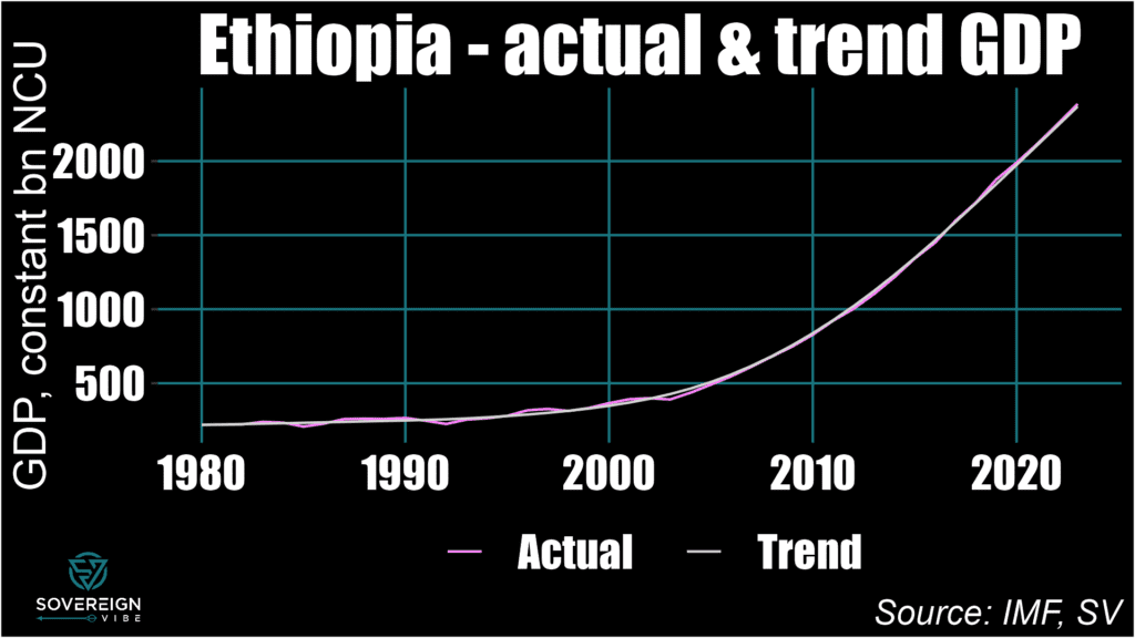 Zambia sustained a positive output gap throughout most of the 2010s, until an economic contraction in 2020 led it into negative territory, though the gap turned positive again in 2023. Once one of the world’s fastest growing economies, Ethiopia’s economic growth has also been remarkably stable, despite the recent Tigray conflict. This makes for a more “boring” chart but is a credit to the country’s economy, with the output gap in marginally positive territory.