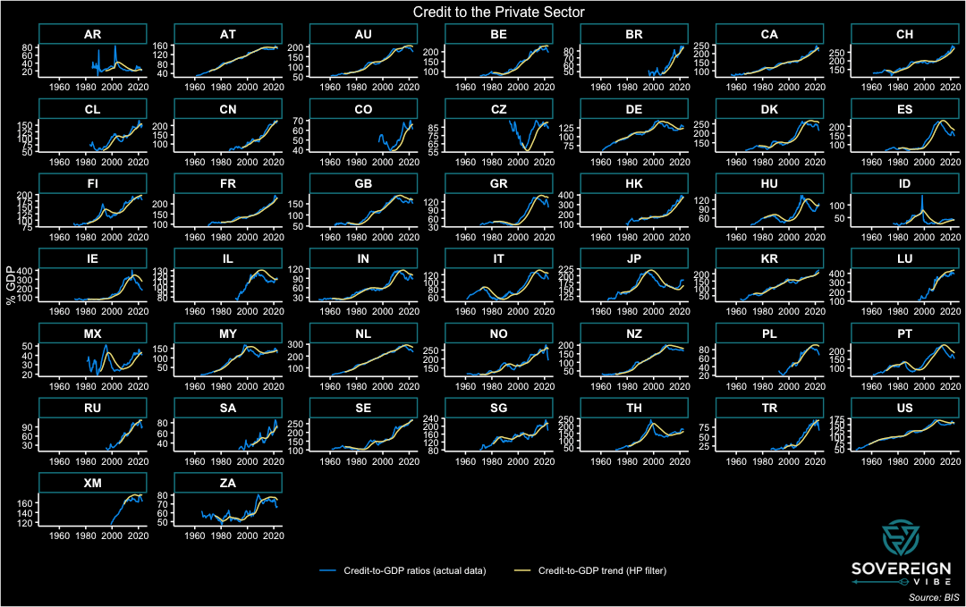 A credit-to-GDP gap is thus an actual observation at time t minus the trend in the same time period. As such, a positive credit gap is one in which lending is above trend, whereas a negative one is below. The credit gap coefficient in the IMF model is positive, as is the case in other models in the financial crisis academic literature, meaning that higher values are associated with an increased likelihood of sovereign debt strains. Looking at quarterly data through end-20221 from the Bank of International Settlements on 43 countries plus the Euro Area, this first set of charts presents the actual credit-to-GDP ratios in blue, the smoothed trend in yellow, and the credit-to-GDP gaps in green.