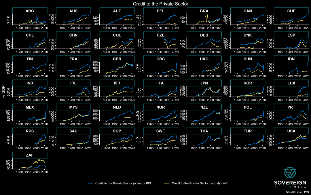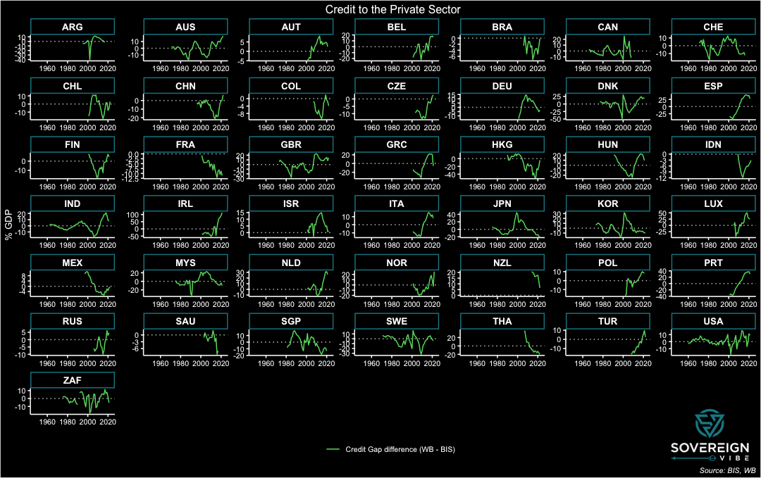 To simplify further, the difference in the BIS and World Bank credit gaps, where the former is subtracted from the latter (difference = WB – BIS), features in the chart above. Ideally, the data readings would all be horizontal lines at zero or at least resemble a stationary process hovering above and below zero. While some countries do have these features – Sweden, the UK, the US, and Switzerland, among others, a large cohort exhibits some sort of bias. A statistical test of this difference in credit gaps across this panel of countries over these years would likely reject the notion that the difference is equal to zero. Nevertheless, the World Bank domestic credit to private sector by banks indicator seems fit for purpose, particularly given the large role that domestic banks play in credit provision in most economies.